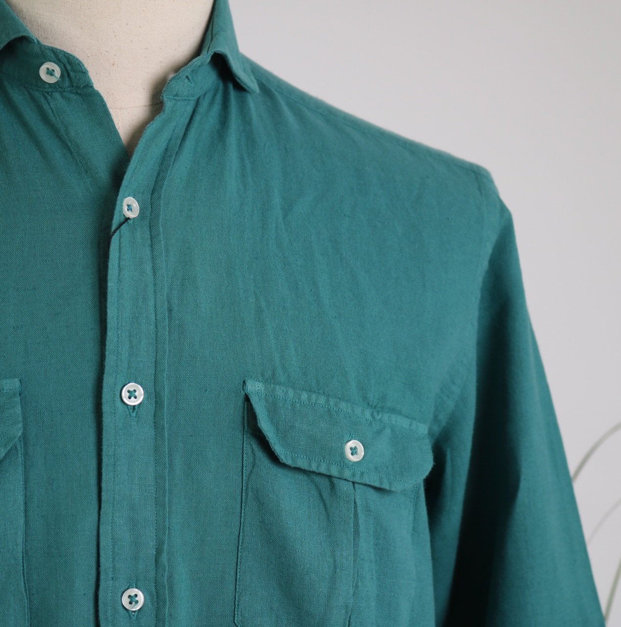 Camisa tintada color verde con 4 bolsillos, composición mezcla de lino y algodón