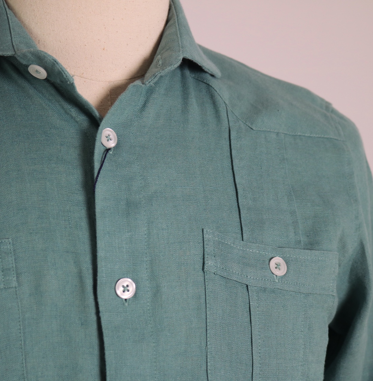 Camisa guayabera color verde. Composición 100% lino. Lleva cuatro bolsillos delanteros con tablones, y dos tablones en la espalda. Cuello cutaway sin botón. Este modelo no da mucha talla, si está entre talla recomendable elegir la mayor de ellas.